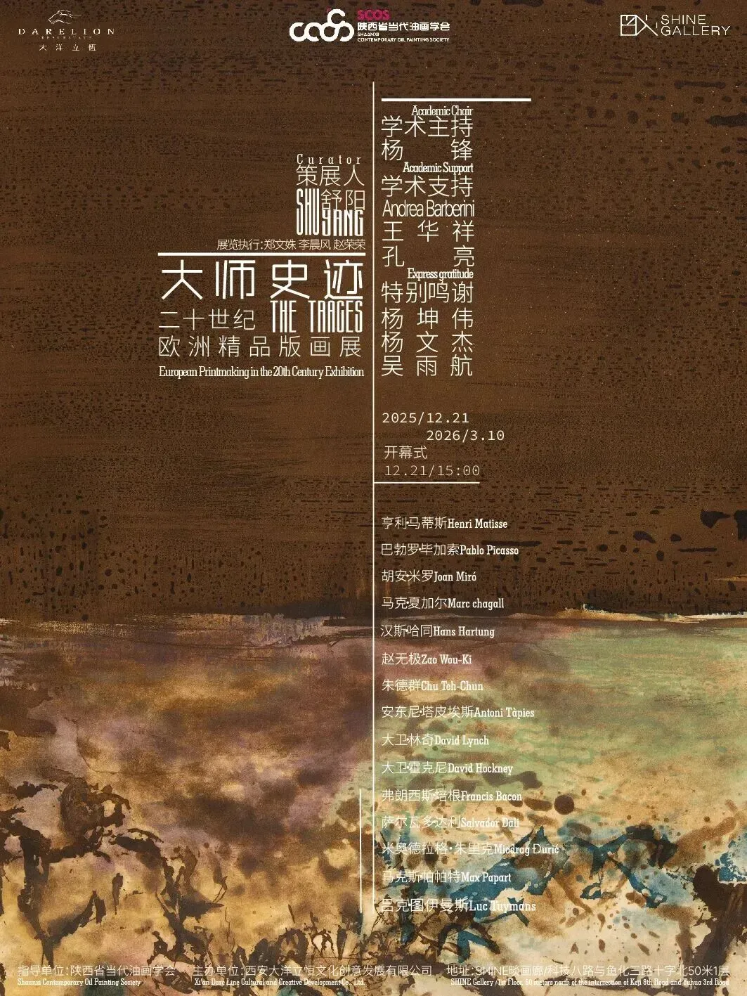 此次展览有亨利·马蒂斯(Henri Matisse)与巴勃罗·毕加索(Pablo Picasso)等现代主义先驱对形式与情感的革新;马克·夏加尔(Marc chagall)与胡安·米罗(Joan Miro)以奇幻符号构建超现实梦境的诗意;汉斯·哈同(Hans Hartung)、朱德群(Chu Ieh-Chun)、赵无极(Zao Wou-Ki)与安东尼·塔皮埃斯(Antoni Tapies)融合东西方美学、几何韵律、材料碰撞的抽象维度的探索实验;萨尔瓦多达利(Salvador Dali)、弗朗西斯培根(Francis Bacon)、大卫·霍克尼(David Hockney)、大卫·林奇(David Lynch)、米奥德拉格·朱里克(Miodrag Duric)、马克斯·帕帕特(Max Papart)、吕克·图伊曼斯(Luc Tuymans)对当代叙事的延伸。30余幅版画承载的世纪艺术大师灵魂,能清晰窥见现代主义艺术星河中每一颗星辰的独特光芒。