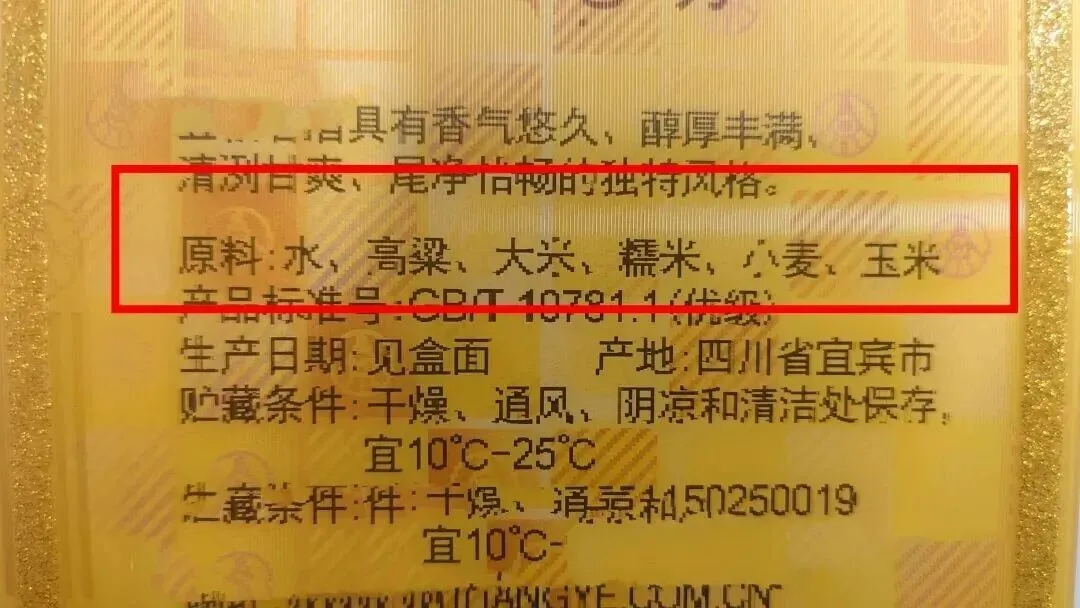 配料表位置一般在背标下半部分,字体更小,但一定要看.建议大家用一个原则:纯粮酒的配料,通常就是“水+粮食”.