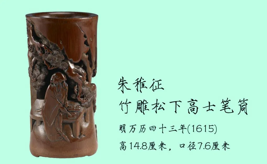 延伸阅读:嘉定建县于南宋嘉定十年(1217),以宋宁宗年号为县名,至明代已发展为江南繁华县城,最终催生了名满天下的嘉定竹刻。朱稚征,与其父朱缨、祖父朱鹤合称“嘉定三朱”。竹刻正是经过朱氏祖孙的努力而嚼起为嘉定之特产,并发展为江南雅玩雕刻的代表品种。上海博物馆亦藏有“三朱”之一、朱稚征父亲朱缨的作品——透雕刘阮入天台竹香筒。这件香简1966年出土于上海宝山顾村明朱守城墓,以东汉时划晨、阮肇入天台遇神仙的故事为题材创作。史载朱缨以雕刻人物见长,从此件香筒上人物的刻画来看,足以证明记载不虚。朱稚征,号三松,与其父朱缨(小松)、祖朱鹤(松邻),三世并称高士。三松活跃于明万历、天启年间,全面继承朱鹤开创的嘉定竹刻流派及朱缨深雕技法,形成“三朱”艺术谱系。故宫博物院藏有其竹雕和合二仙、仕女图笔筒等十余件作品,其中《仕女图笔筒》刻有“万历甲寅秋月三松作”款识。其创作推动竹刻由工匠技艺转向文人艺术,清代《南村随笔》载其作品明末即被视为珍宝。2006年嘉定竹刻列入国家级非物质文化遗产名录,朱氏三代技艺为核心保护内容。