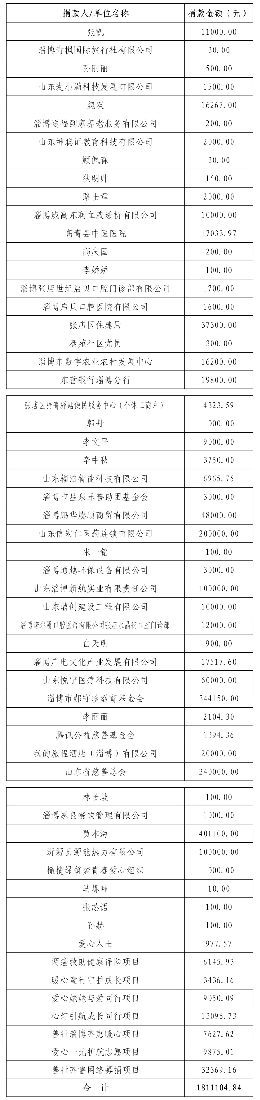 14.淄博记忆烘焙食品有限公司捐赠面包524袋、甜品662盒,总价值1.6328万元,定向用于淄博市社会福利院、淄博市救助管理站、张店夕阳红老年公寓、淄博市张店区爱塔特殊儿童康复中心、淄博高新区四宝山街道如康家园、淄博益宁精神病医院。