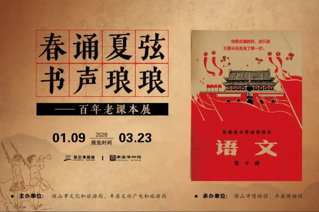 2026年1月9日,由保山市文化和旅游局、丰县文体广电和旅游局主办,保山市博物、丰县博物馆承办的《春诵夏弦 书声琅琅——百年老课本展》在保山市博物馆一楼六号临展厅开展。