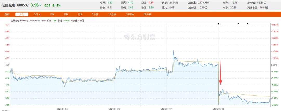 受此利空消息影响,亿晶光电1月8日股价开盘即大跌,跌幅超8%。截至当日收盘,该股报3.96元/股,市盈率为-16.45,总市值46.88亿元。