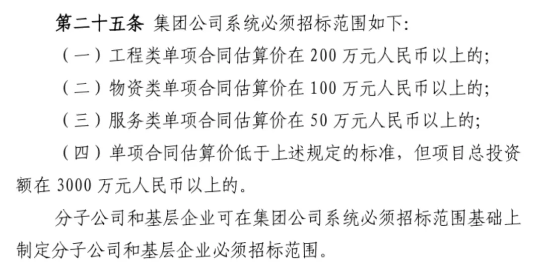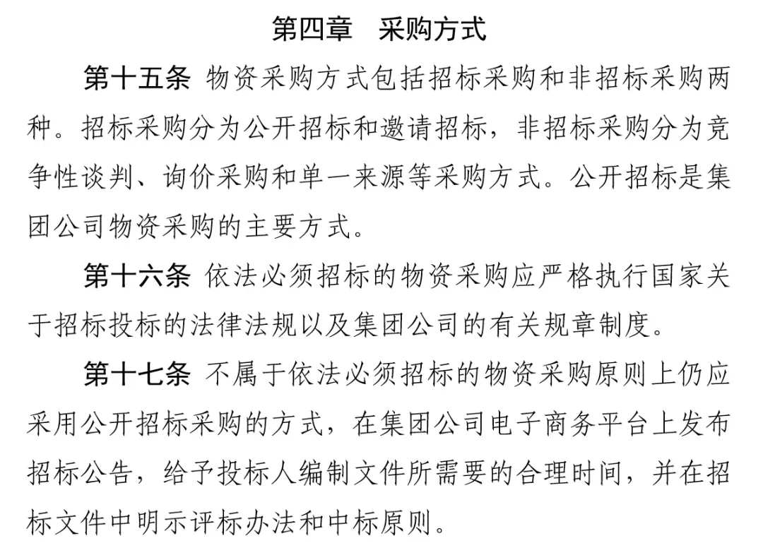 第五条 企业应当根据信息系统建设整体规划提出项目建设方案,明确建设目标、人员配备、职责分工、经费保障和进度安排等相关内容,按照规定的权限和程序审批后实施。企业信息系统归口管理部门应当组织内部各单位提出开发需求和关键控制点,规范开发流程,明确系统设计、编程、安装调试、验收、上线等全过程的管理要求,严格按照建设方案、开发流程和相关要求组织开发工作。企业开发信息系统,可以采取自行开发、外购调试、业务外包等方式。选定外购调试或业务外包方式的,应当采用公开招标等形式择优确定供应商或开发单位。至此,对于《招投标法》没有规定必须招标之外的大宗物资、设备和服务等采购是否都可以不招标采购,应该说答案已经很显然。2022年4月21日上午,国资委在“对标世界一流采购交易管理体系推进会”上对中国大唐集团在“采购规范透明”和“成本质量管控”两方面作出两次点名表扬。中国大唐认真贯彻落实国资委关于加强采购管理的各项部署和要求,围绕中国大唐集团“四大攻坚战”,成立采购与物资管理全面提升工作专项领导小组和八个专项工作组,制定采购效能提升等多项提升方案及具体措施,在采购与物资管理体制机制、采购规范和风险防范、采购质量和效率、不合格供应商整治、采购队伍专业水平、专家及专家库治理和长协采购等方面均取得了明显提升。《中国大唐集团公司采购管理制度》对于必须招标的范围进行如下规定。《中国华能集团公司物资采购管理办法》对于必须招标的范围进行如下规定。