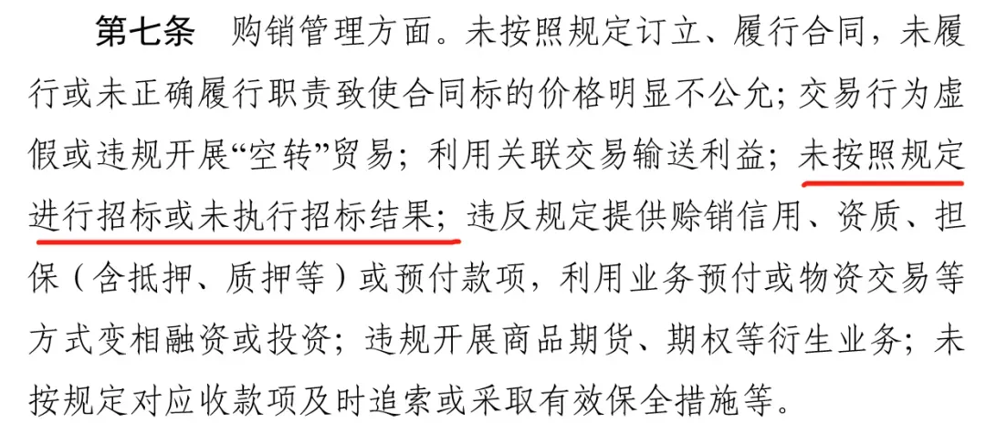 由于版面限制,只能选取两家央企进行展示,更多央企案例,你可以访问他们各自企业的采购平台。中央和地方国资监管部门出台的“企业违规经营投资责任追究暂行办法”对采购招标都有涉及。在《安徽省省属企业违规经营投资责任追究暂行办法》第七条明确指出是未按照规定进行招标,而不是使用未按照法律要求进行招标。这里的“规定”包括了内部控制指引的要求。