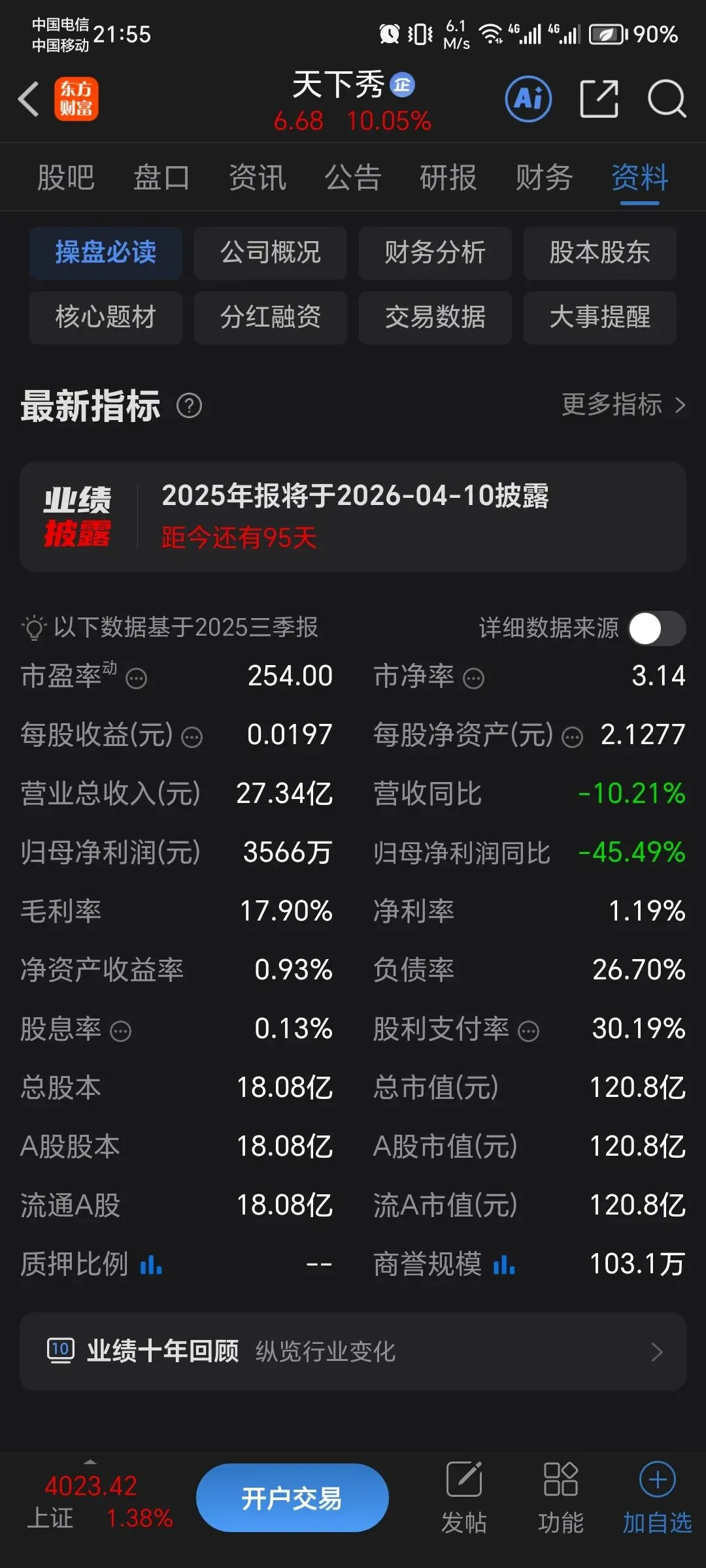 2026 年 1 月 5 日,天下秀涨停收盘 6.68 元,涨幅 10.05%,成交额 17.89 亿元,换手率 9.32%,总市值 120.76 亿元,主力资金净流入 5.34 亿元。该股于 9 点 52 分涨停,3 次打开涨停,截止收盘封单资金为 5599.58 万元。