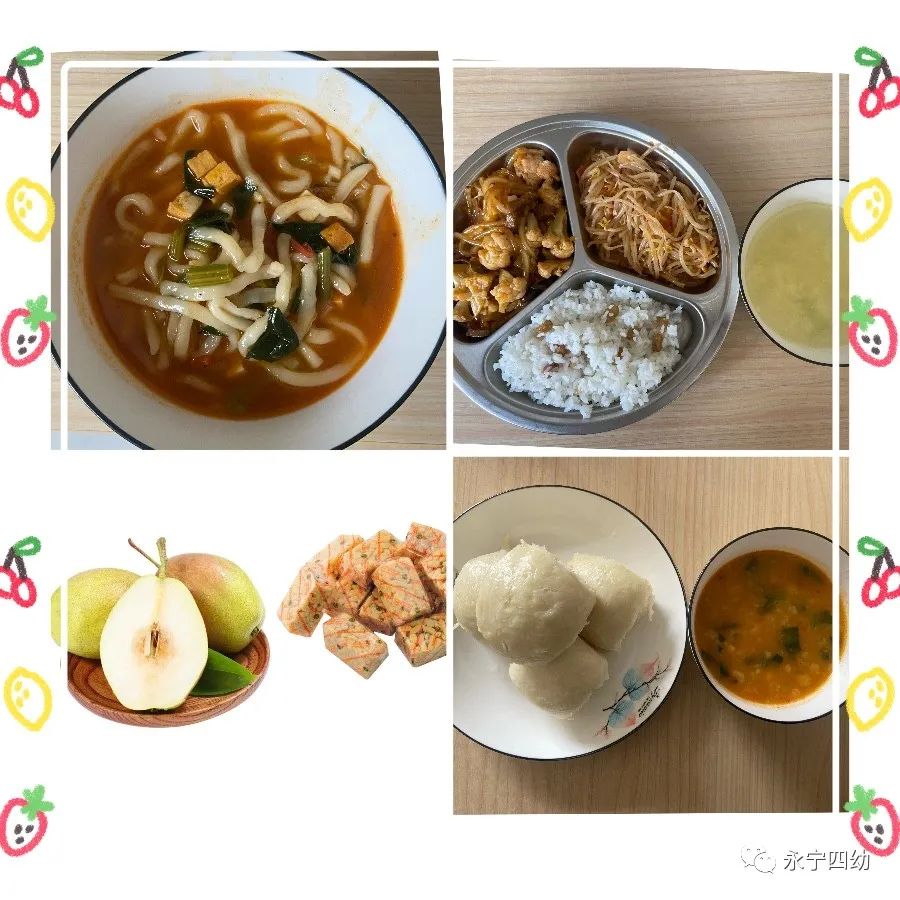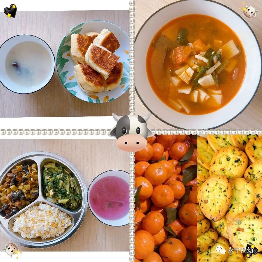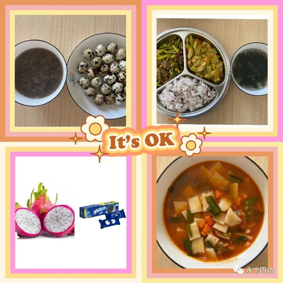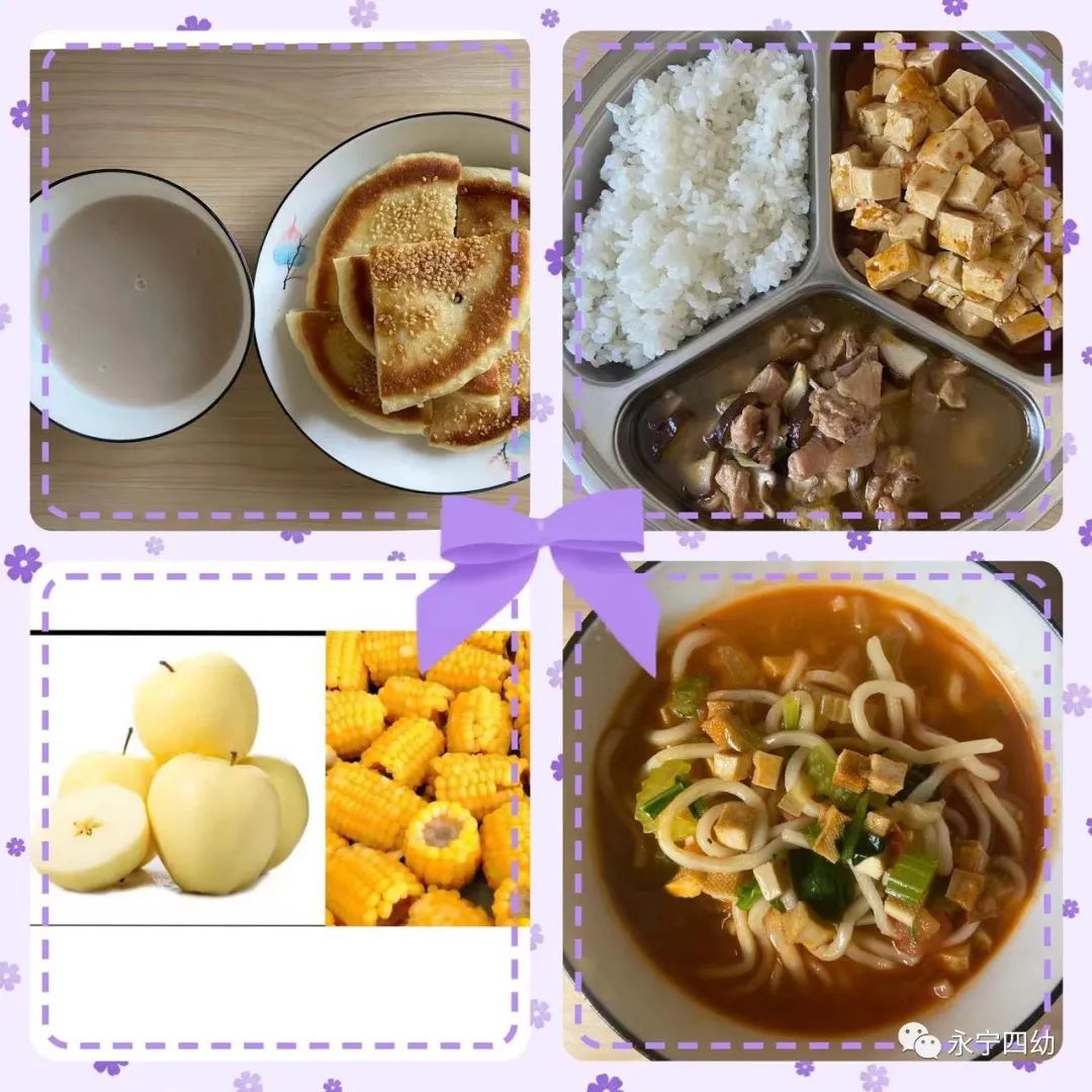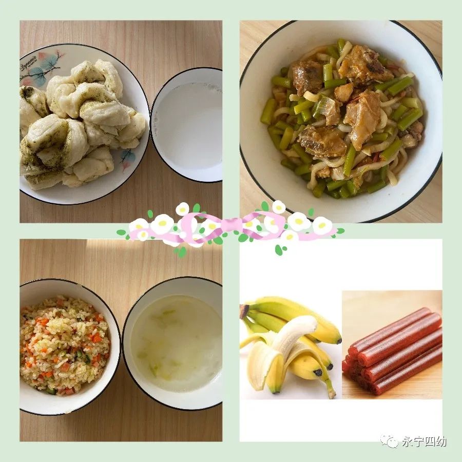 豆豆米饭、蒜台炒肉、素炒茭瓜、紫菜汤