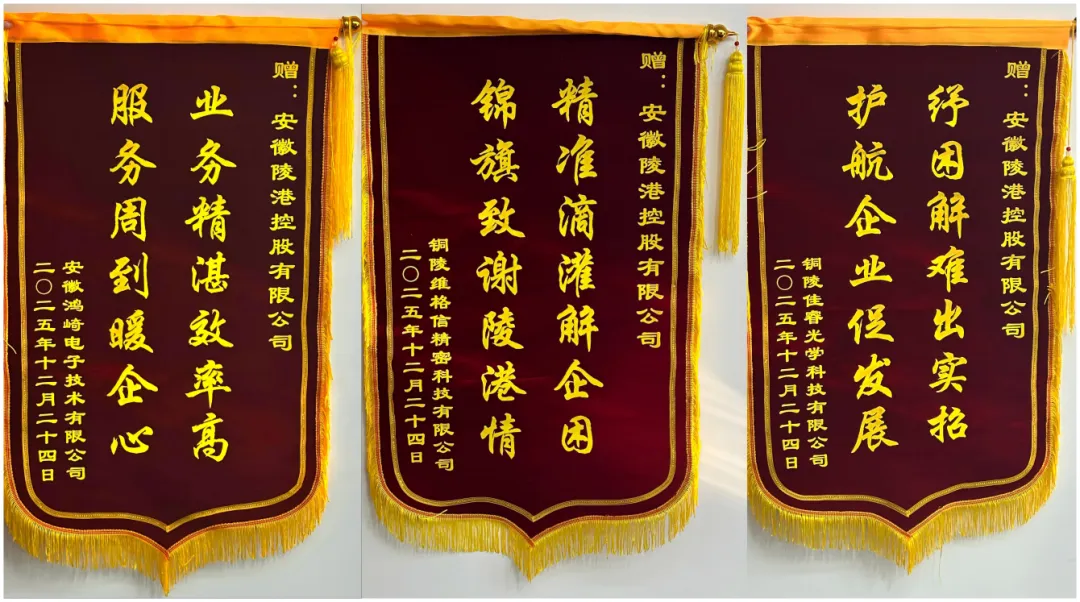 近日,安徽鸿崎电子技术有限公司代表将一面绣着“业务精湛效率高,服务周到暖人心”的锦旗送到安徽陵港控股有限公司。同日,铜陵佳睿光学科技有限公司、铜陵维格信精密科技有限公司也分别送来锦旗,对陵港控股下属供应链公司在企业融资过程中提供的高效服务表达诚挚感谢。这一面面锦旗,不仅承载着园区企业的认可与信赖,也彰显了公司深耕服务、助力实体经济发展的初心与担当。