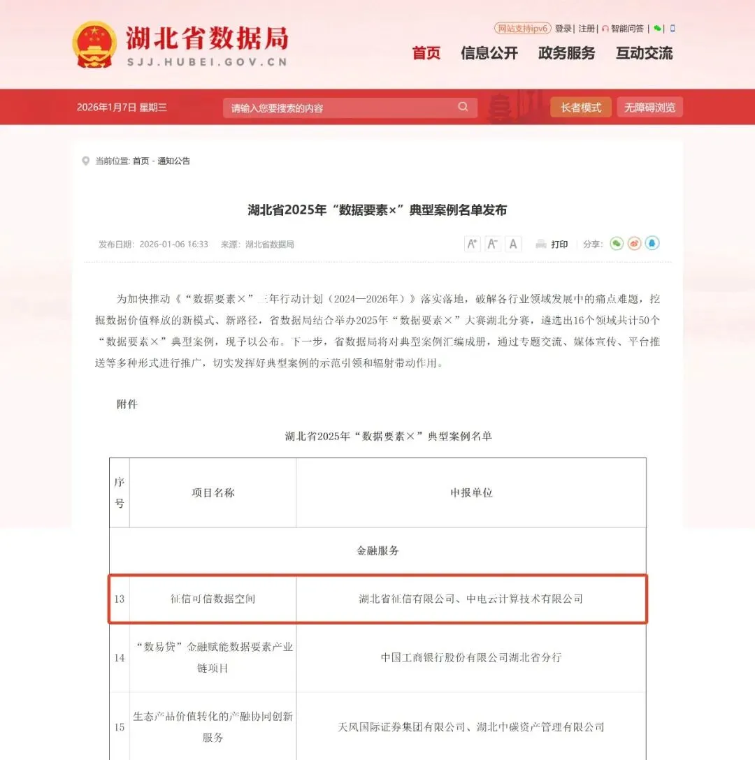省数据局日前发布湖北省2025年“数据要素×”典型案例名单,湖北省征信公司联合中电云打造的“征信可信数据空间”项目成功入选。