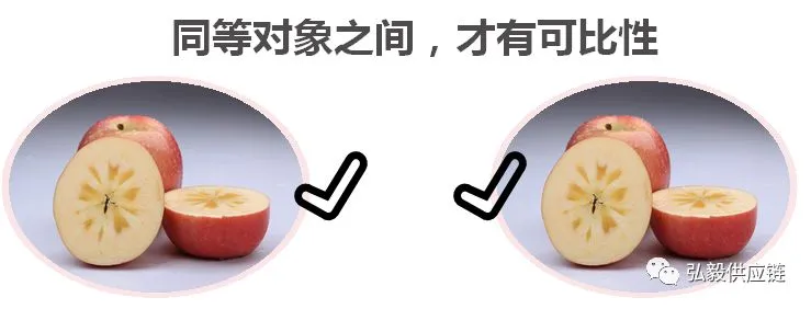 苹果和苹果就可以比较了,大小、含糖量、口感等等,都是很好的评判标准。英语里有一句俗语,apple to apple,指的就是同等事物才能进行对比。