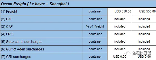 例如上图的“勒阿弗尔到上海”线路的海运费,蓝色部分是由客户提供,货代只需要填写白色区域就可以了。