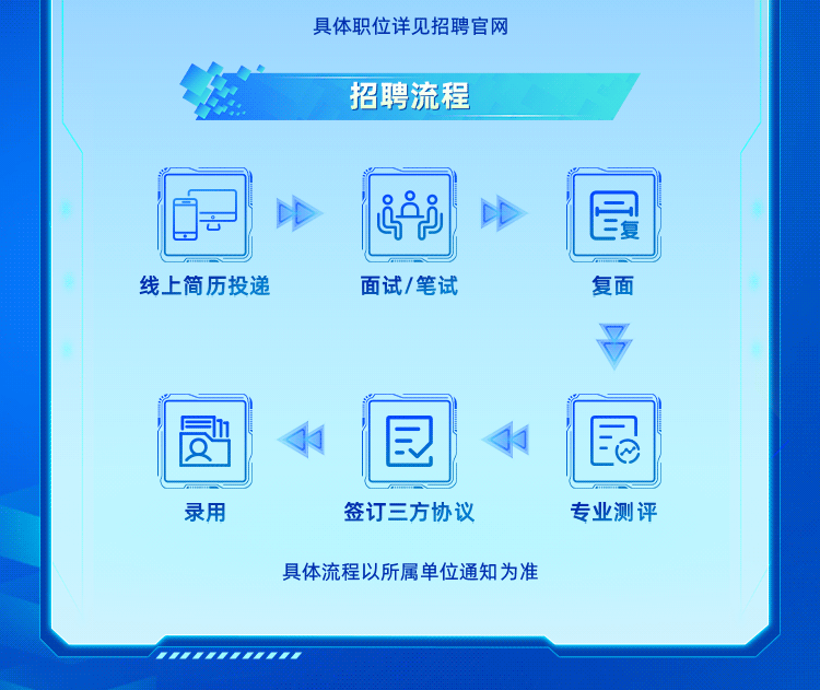 本次招聘流程依次为网上预报名、现场报名确认、资格审查、笔试、面试、考察、体检、拟录用人员公示等环节。应聘人员应在完成网上预报名后,必须在规定时间前往招聘会站点进行现场报名确认,经资格审查通过后,方可参加现场考试。
