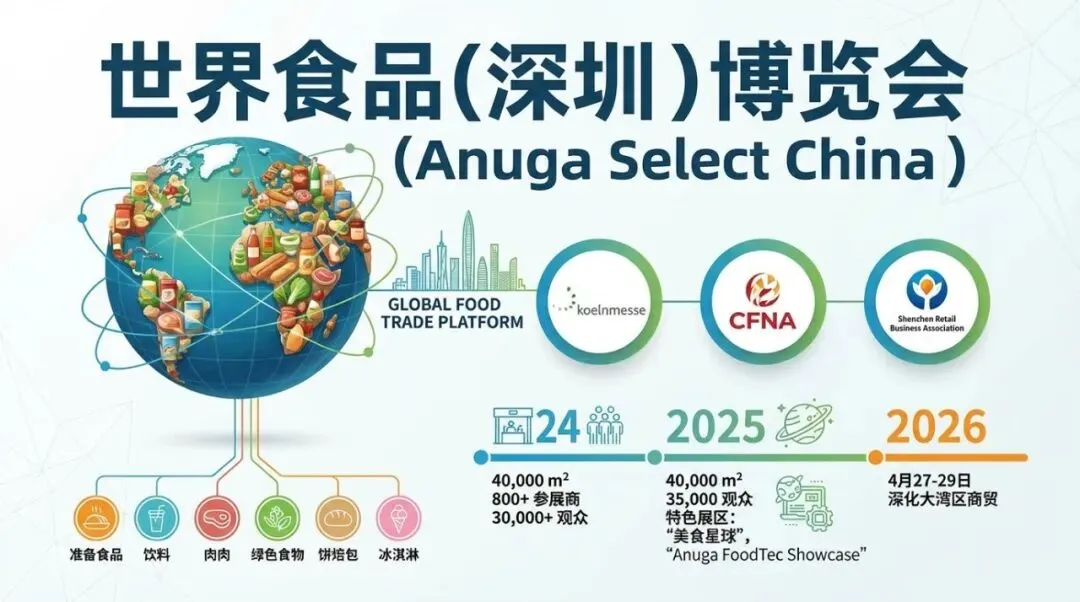 Anuga Select China(世界食品(深圳)博览会)是由科隆展览、中国食品土畜进出口商会及深圳市零售商业行业协会联合主办的国际性食品行业盛会。首届展会于2024年4月24日至26日在深圳会展中心(福田区)成功举办,依托德国科隆世界食品博览会的全球资源,搭建起覆盖食品饮料全产业链的商贸合作平台。