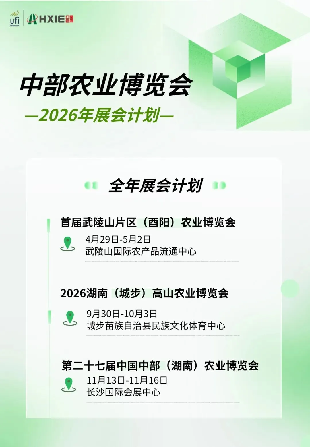第二十七届中国中部(湖南)农业博览会⏰2026年11月13日-11月16日?长沙国际会展中心?展品范围: 品牌农产品(包括果蔬、肉类、水产、 茶叶、粮油等)、食品加工产品、特色美食、休闲食品、预制食材、林特产品、 智慧农业、农机农资、农业金融等。免责声明:本宣传文案所涉数据、图片、视频等资料部分来源于网络,转载目的在于传递更多信息,内容仅供参考,准确内容以展会官网发布为准。如涉及侵权,请联系删除。