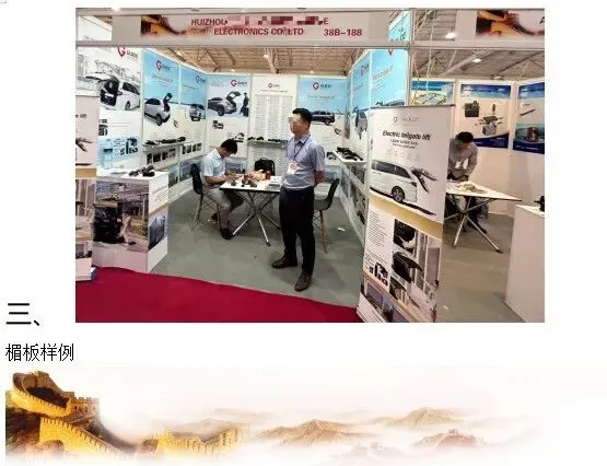 鲜明有个性的的色彩可以产生强烈的视觉冲击感,容易引起客户的关注;专业化就要从产品做起,产品的展示,摆放,归类等都需要设计好;名片、海报、宣传册、LOGO 提前在国内印刷准备好带去参展人员要做好基本的礼仪,比如:服装搭配,礼貌问答,保持微笑,和客户交换名片及给材料都要双手递给对方等。当然也要保持好的工作状态,尽量不要一直坐在展位里面等,不要长时间埋头刷手机和看电脑,不要长时间和同事闲聊,尽量不要在展位上饮食(特别是有气味性的食物)。海报根据展位的宽度,设计好提交主办,布展当天可以用粘钩或双面胶贴在展位的展墙上,设计要突出产品和适用的车型,明确联系方式和公司名称LOGO,工厂也可展示车间和库存照片实力。可以给路过的客户发一些关于自己公司产品介绍的宣传彩页,吸引客户关注您的展位;尽量把名片印制精致一些,除了联系方式,最好也能突出一下自己产品的优势。有的客户喜欢收集名片,所以精美的名片,这样让客户不轻意扔掉;每个来访的客户都要做好详细的记录;带好笔记本/订书器,笔记本做记录,每位买家的联系方式和咨询信息记录下来。带上自己公司的PPT介绍及产品的电子版报价单,产品图片,产品包装,产品设计图,产品细节材料,合作用户材料,一旦碰到有意向的客户,随时可以给他详细演示。准备一些有个性的小礼品,或U盘存上公司的产品目录,可以送给客户,加深客户对自己的印象。