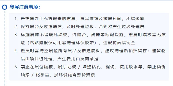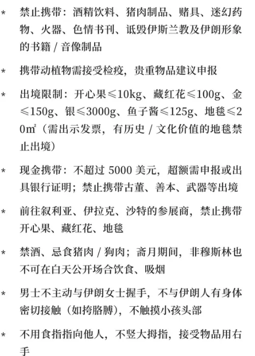 衣着注意事项:伊朗是伊斯兰教国家,对妇女的衣着要求比较严格。在公共场合,妇女要长袖长裤。伊朗已经放开对女性头巾的要求,不戴头巾也可以,建议随身戴一条围巾,因为部分民众仍然有传统喜好,男人着装相对宽松,西装和休闲服均可,注意防寒不得占据过道或移到摊位外。不得擅自挪动或叫现场工人移动展具,万一有损毁,展商要承担赔偿责任。电源在展位内角,很短,建议自带一条插线板做延长线使用。