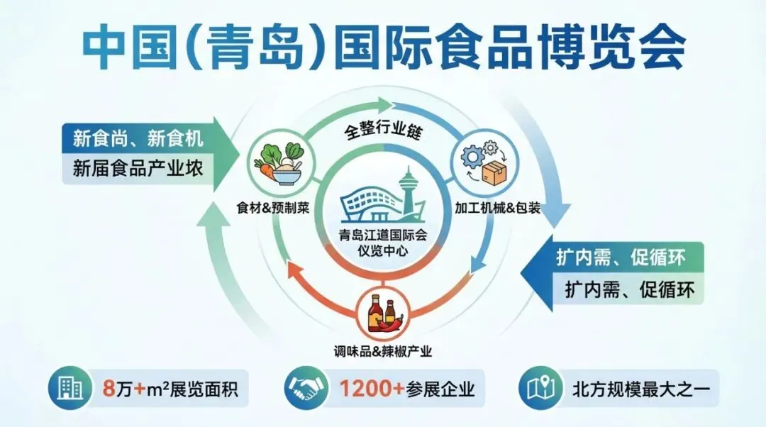 由中国食品工业协会、山东省食品工业协会等权威机构联合主办的中国(青岛)国际食品博览会,自21世纪初创办以来,已发展成为我国北方地区规模领先的食品工业展览平台。展会以"新食尚引领、新机遇开拓、内需扩容、产业循环促进"为核心主题,构建起覆盖食材原料、预制菜品、调味品、食品加工机械等全产业链的展示体系,并通过产业论坛、品牌推介会等配套活动,持续推动食品行业上下游深度对接与高质量发展。