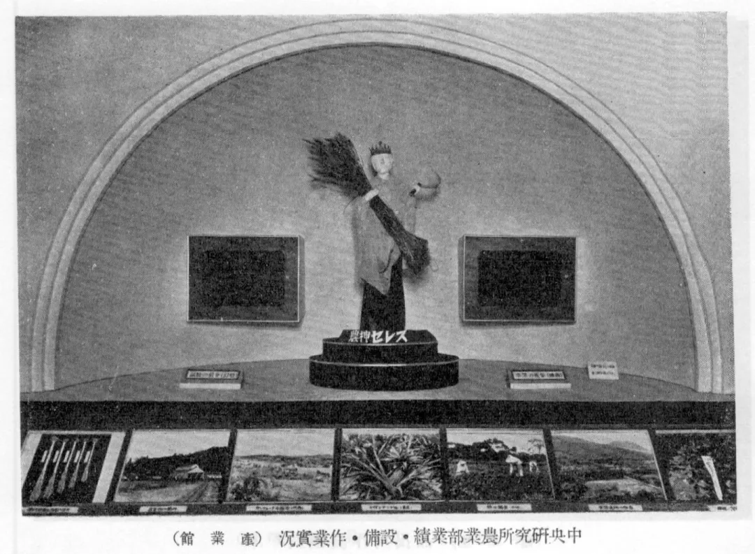 产业馆一景,展示主题为「中央研究所农业部业绩.设备.作业实况」。半圆形展示台以一尊手持稻穗、身长二尺半的「セレス」为视觉中心,在神像的背后两旁各有一个窗格,一边播放幻灯片,一边播放影片,而神像下为七张全开大的透明片,内容分别为:绿肥、士林园艺试验支所全景、采茶情况、嘉义支所的凤梨、恒春支所的牛、农业部温室和水稻发育。
