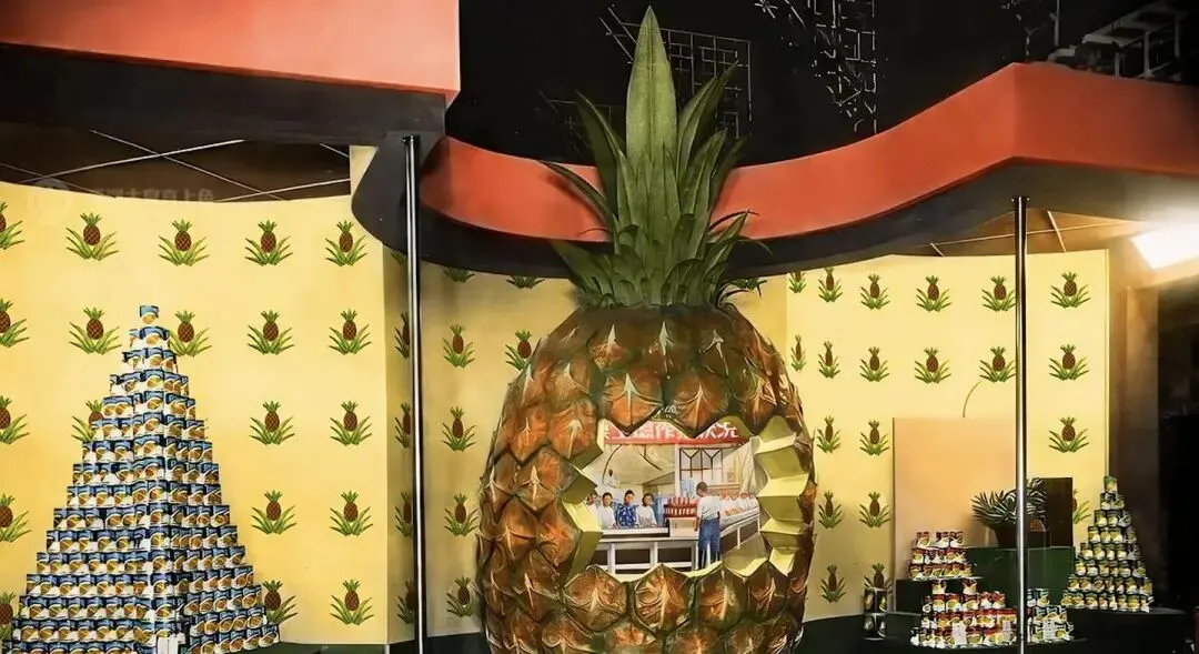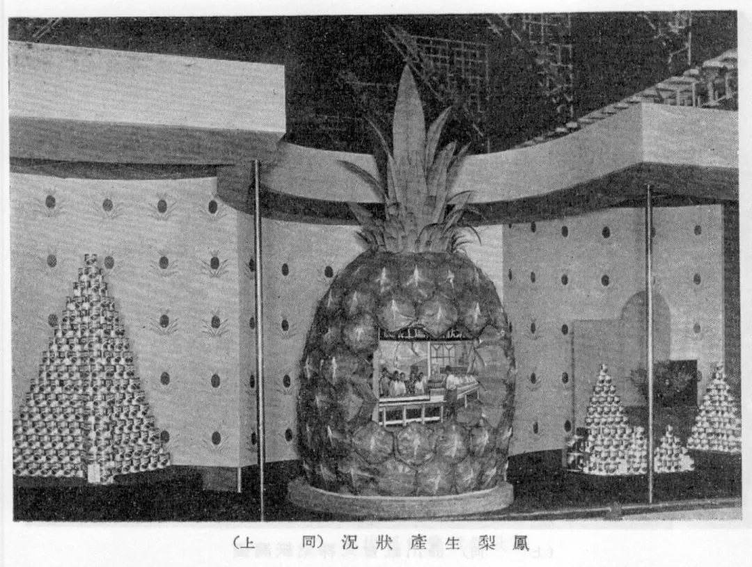 馆内还有巨型凤梨模型,凤梨模型两旁还叠有两座凤梨罐头塔,大凤梨模型上还有一个内嵌回转式装置,轮流呈现凤梨田、采收、制罐等作业的情景。