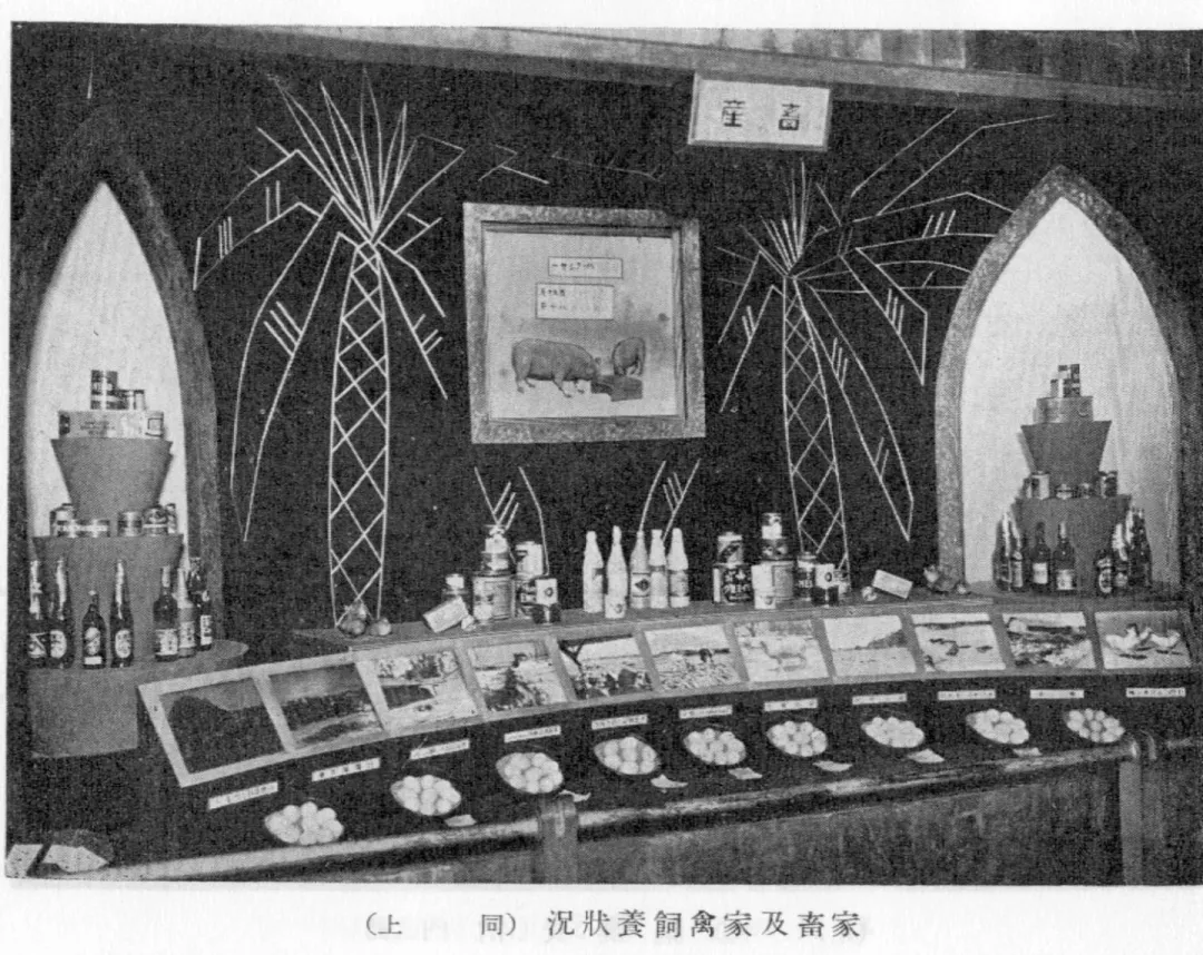 「家畜及家禽饲养状况」放置有蜂蜜、蜜蜡、明治与森永制果产品、以及各种肉制品与乳制品。壁面画着银色椰子树影轮廓线,中央方框则是一个照片轮播的装置,呈现一幅幅马牛耕作以及牲畜饲养情况,前方还有一列照片展示台,展出11张透明照片,照片展示台前方则摆满上各种产品。
