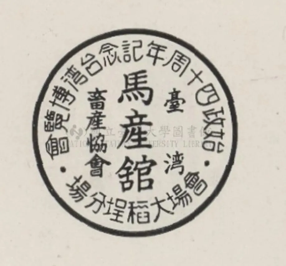 殖产局为了配合日本国内的马政计画,在台湾推行马政计画,而与竞马协会、军部、畜产协会共同设立马产馆。展览馆内陈列马事资料,展示马的效能。展览馆外设有儿童马场,提供小型马供儿童骑乘。此外,竞马协会也于台北春季赛马和新竹秋季赛马后,特别在台北和新竹各举办一次“台湾博览会纪念赛马”。