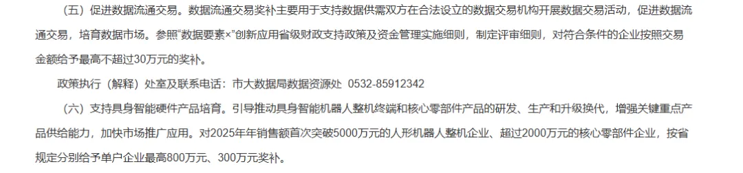 工信部带头推进智能制造进程,目前已建成3.5万余家基础级、7000余家先进级和500余家卓越智能工厂,覆盖九成以上制造业行业大类。同事通过编制《人形机器人标准体系框架》、开展“深度行”技术对接活动,加速推进人形机器人规模化落地。地方层面政策密集,青岛对2025年整机年销售额首次突破5000万的人形机器人企业,最高奖励800万元。