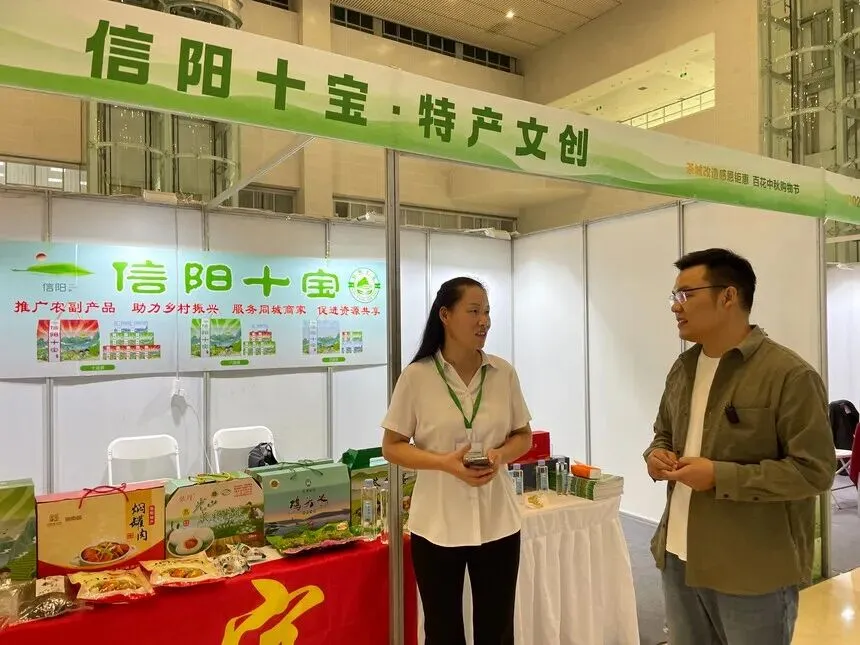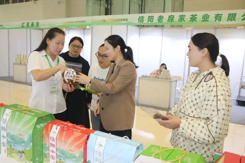 9月28日,由信阳华信建投集团主办的2025信阳国际茶城商户展销会,在百花会展中心北厅正式开幕。“信阳十宝”农副产品公益品牌旗下信茶春毛尖、令尹黄酒、古茶沟山泉水等企业产品参展此次活动,吸引众多游客驻足品鉴,受到广泛关注。