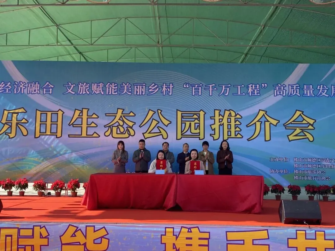 活动签约环节备受瞩目:佛山市农业旅游协会会长郭爱环女士与乐田生态公园代表,签署《农旅产业创新战略合作协议》;佛山市农业产业联合会—农业科技分会代表、佛山鲲鹏现代农业研究院副院长张君红女士与乐田生态公园代表,签署《科普基地+旅游双IP,农技专家资源辅能,科企营销战略合作协议》。两大协议的签署,将推动农旅资源整合、科普与旅游融合发展,为构建“文化体验—消费买单—反哺文化传承”的闭环注入强劲动力。
