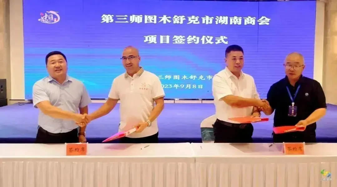 师市湖南商会揭牌后,在招商推介和签约仪式上,商会企业与部分团镇、街道签订招商引资项目协议,与学校签订“湘商助学”协议。