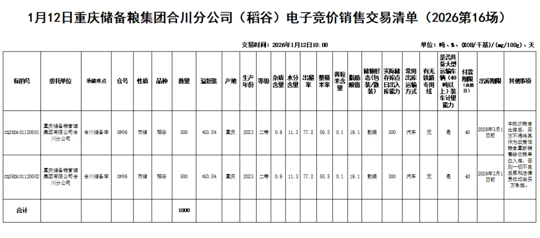 2. 报名时间:2026年1月12日8:00前。报名参与交易即视作全面认可并遵守《重庆市地方政府储备竞价销售交易规则》和交易公告、交易清单等要求。