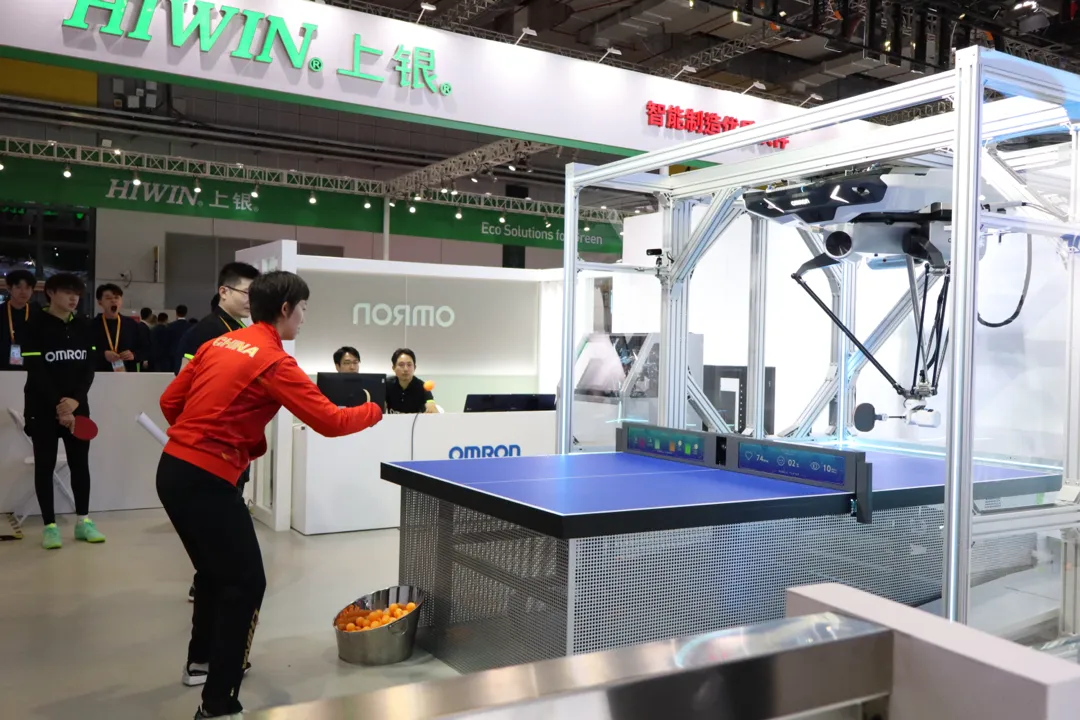 11月6日,在第七届中国国际进口博览会技术装备展区,工作人员与欧姆龙乒乓球教练机器人互动。