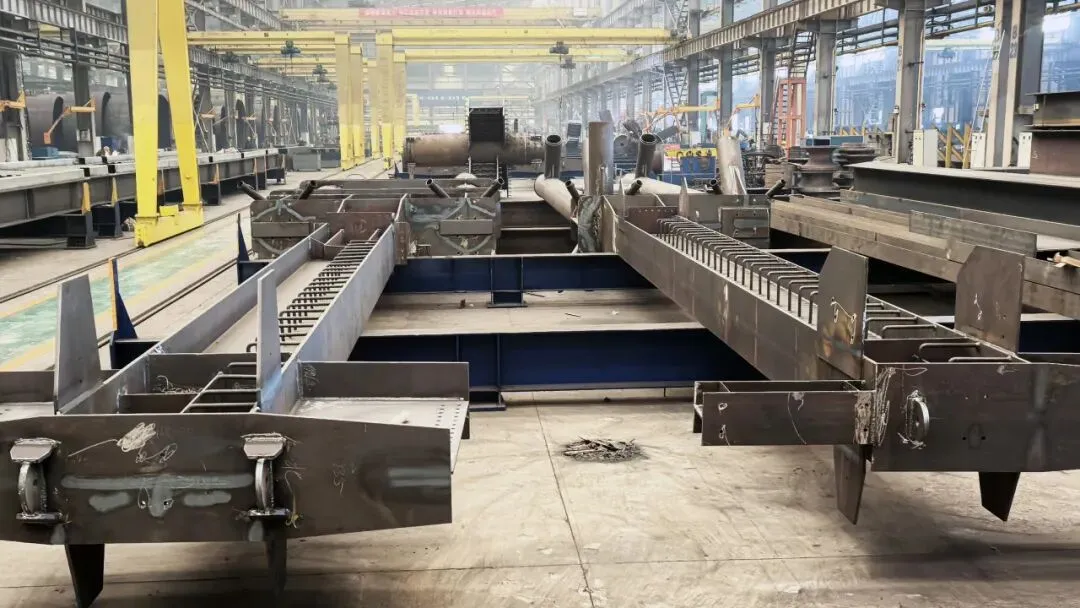 面对时间紧、任务重的挑战,车间迅速响应,科学统筹、精细管控,钢结构车间全体职工凝心聚力、主动担当,争分夺秒投身生产攻坚。该项目厂房主体采用焊接 H 型钢与圆钢管组合双肢格构柱,屋面为焊接 H 型变截面钢梁,吊车梁系统涵盖钢梁、辅助桁架等关键部件,对制造工艺提出严苛考验,钢结构制造事业部聚焦技术攻坚核心任务,靶向突破焊接与材料关键瓶颈,以精准举措破解系列难题,通过优化焊接工艺方案,统筹生产计划,从严管控吊车梁主焊缝,严格执行全熔透探伤标准,实现质量零缺陷,强化吊车梁制造全过程检验,精准把控高强螺栓孔钻制精度及预起拱参数,确保关键构件尺寸达标,针对大截面梁特性优化坡口设计,采用分段多层多道施焊工艺,结合焊前反变形与焊后火焰矫正控制变形,以 “CO₂气体保护焊打底+埋弧焊填充盖面”组合工艺提升焊缝合格率。针对冬季低温高湿环境对焊接、防腐涂装的不利影响,严格执行冬季施工规程,落实预热保温、防风防潮措施,优选适配涂料体系,强化过程温湿度监控,攻克季节性制作难题,确保工程质量与进度双达标。