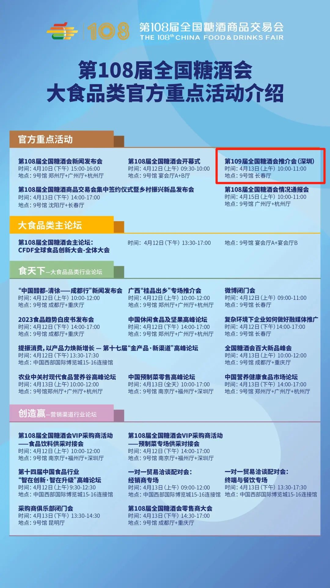 第109届全国糖酒会定于2023年秋季在深圳举行,具体举办场馆和时间等其他信息将于4月13日上午,在中国西部国际博览城9号馆举行的第109届全国糖酒会推介会(深圳)上揭晓。