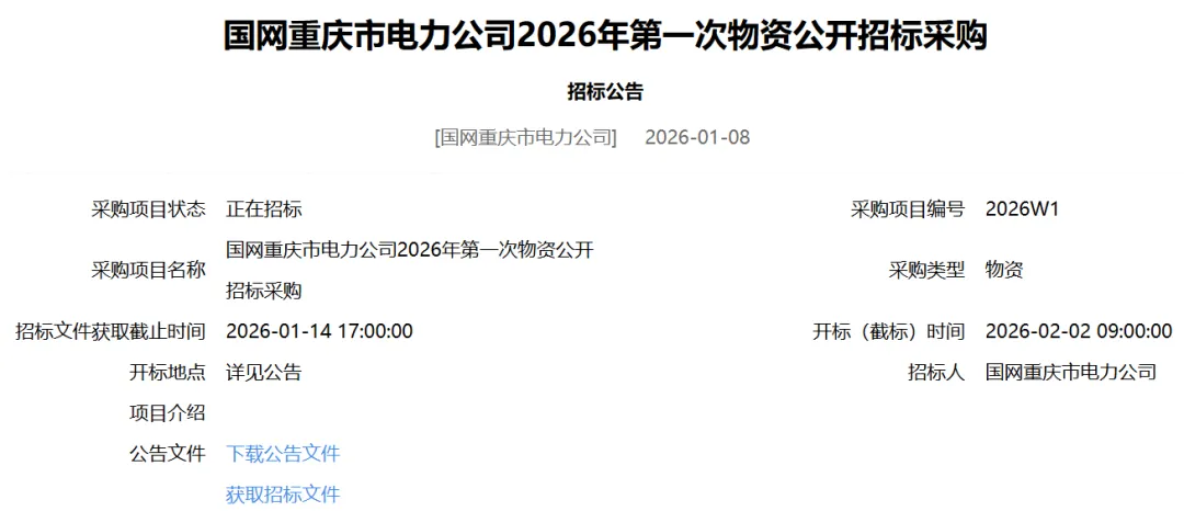 国网重庆市电力公司2026年第一次物资公开招标采购招标公告