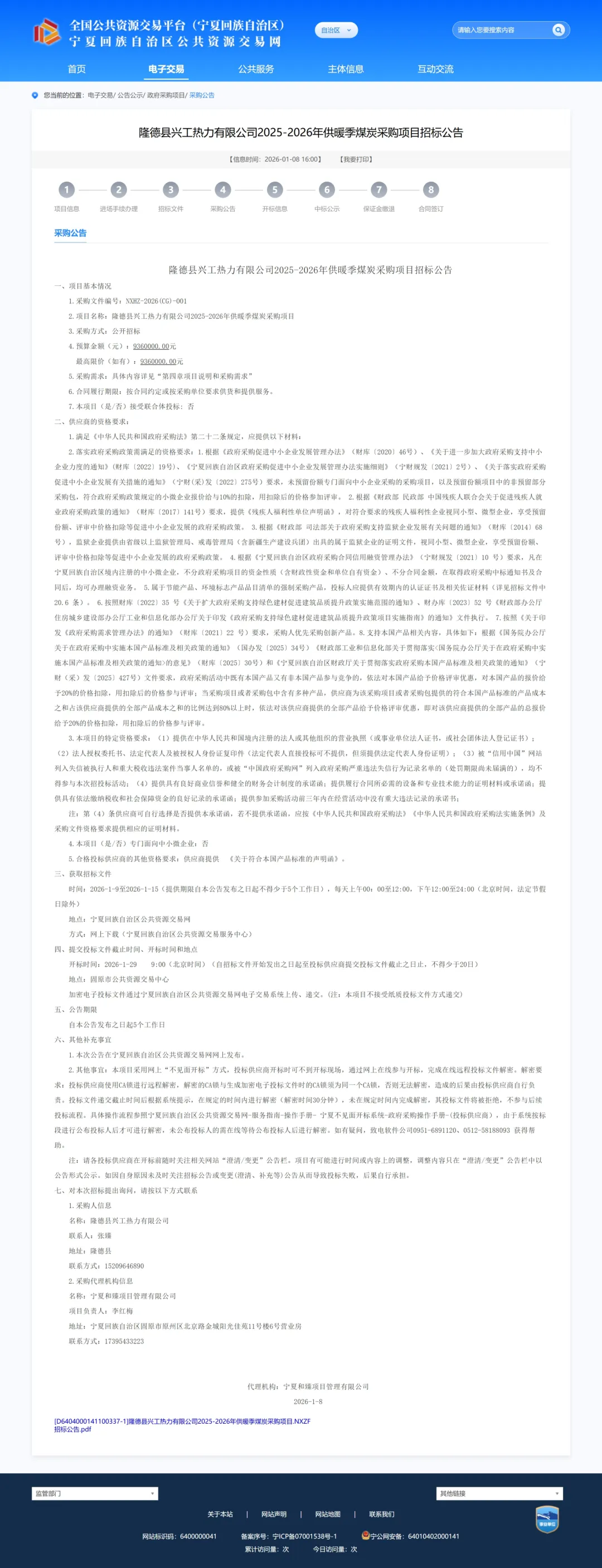 隆德县兴工热力有限公司2025-2026年供暖季煤炭采购项目招标公告