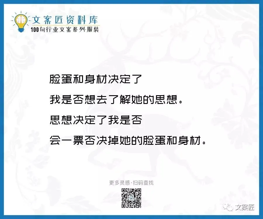 78、脸蛋和身材决定了我是否想去了解她的思想。思想决定了我是否会一票否决掉她的脸蛋和身材。