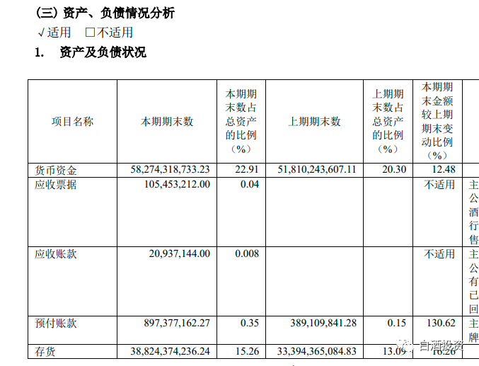 此图,两大看点,一是货币资金,528亿的货币,这个指标,至少说明企业不差钱,银行有存款,是企业发展的关键保障,因为茅台市值太大,所以几百亿的货币资金没什么分析价值。这里要看存货,存货是388亿。存货大家要注意行业,纺织行业,存货是贬值的。比如你存10亿的衣服,可能过几个月只值5亿,因为打折卖才能卖出去,但是白酒,基本都是增值或者保值的,茅台前面算过,存货27.6万吨,至少值2500亿,但是这里只值388亿,直接少了6倍。为什么有腐败,就是这带来的,相当于仓库38元的产品,我拿出去市场卖就是250元,甚至更多,按照茅台的那些老酒算,不仅仅值2500亿,估计至少翻倍值5000亿,但是研究的时候,我们不能按照正常价格算,要按照打折价格算。