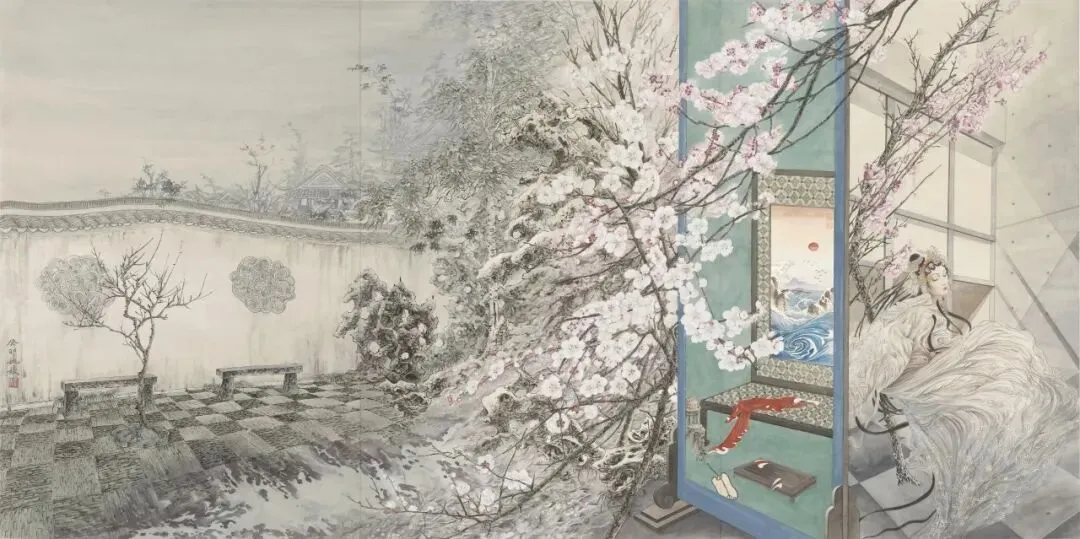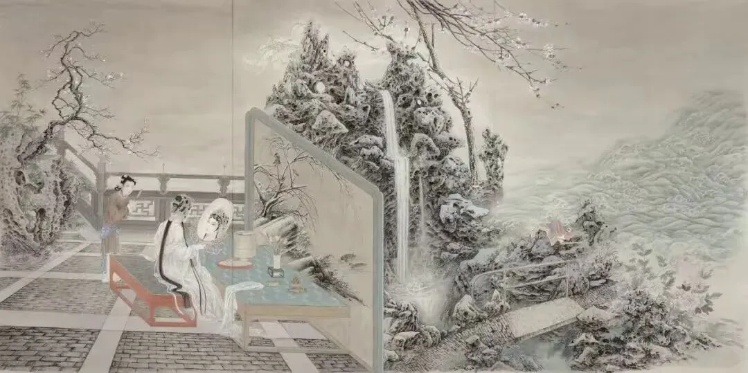 姚媛至少在两个方面带给人惊艳之感:一是不事雕琢,坚持自然而然的当代意象创造。近年来,姚媛古典意蕴的画面里时常有意无意地出现公众熟悉的当下生活场景,这些物像在古典意蕴的表达中娴熟自然;二是赤心如故的对话传统。其古典唯美的对话传统之作无疑是倾听内心召唤的性灵抒写。自步入画坛至今,姚媛绘画中的古典情结便从未迷失过,甚至有历久弥新之势。此种情结呈现出其往昔的苦心经营与坚持,更昭示了其值得展望的未来。
