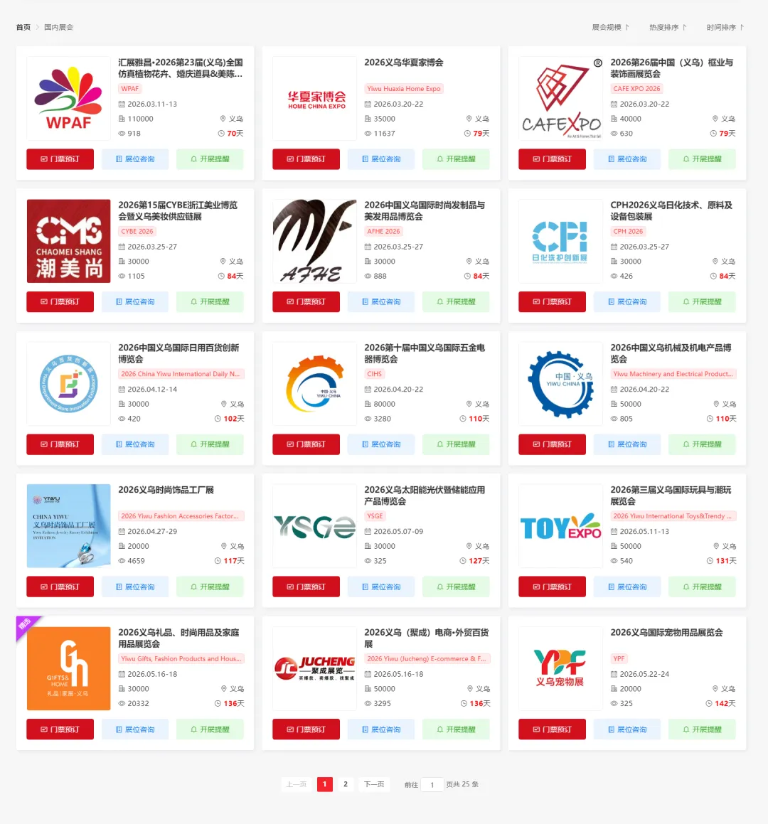 2026年义乌将举办多场重要的展会活动,涵盖了花卉、家具、工艺品、美容、洗涤用品、美发、百货、五金、机械、饰品、太阳能光伏、玩具、礼品、百货、宠物、文具、跨境电商、厨房卫浴、自行车、酒店用品、清洁用品、摩配、照明、贸易、跨境电商展等多个领域。小编为大家整理了2026年义乌展会排期表,希望能帮助你规划行程。末文获取2026义乌展会门票预约入口~(大多门票限时免费)