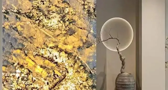 这款装饰墙板采用半透明的奢华石材,巧妙地利用了石材透光的特性,呈现出令人惊艳的效果。背光照射下,石材金色的晶莹纹理散发出柔和的光芒,温暖明亮的色调与天然的有机质感完美融合。这种效果能够营造不同的氛围:白天,它展现出质朴自然的纹理;夜晚,半透明的材质则使其成为光彩夺目的焦点,散发出温馨奢华的光芒。