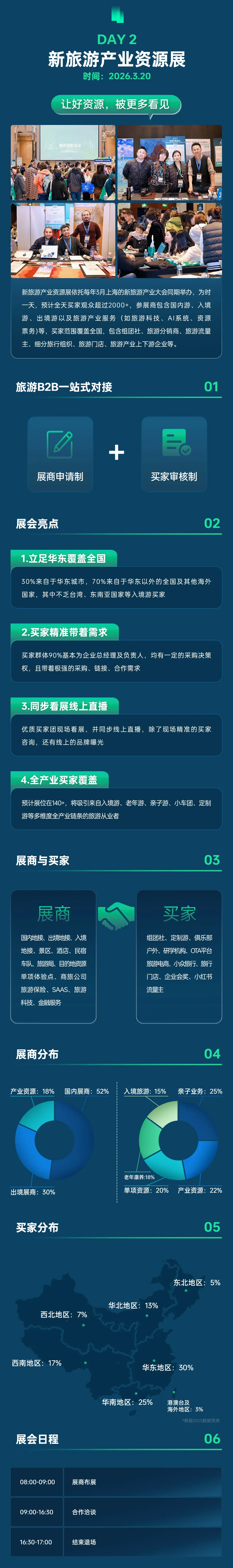 新旅游产业资源展依托每年3月上海的新旅游产业大会同期举办,为时一天,全天买家观众预计超过2000+,参展商包含国内游、入境游、出境游以及旅游产业如(科技、系统、票务、平台、服务、金融)等产业服务,买家范围覆盖全国,包含组团社、旅游分销商、旅游品牌流量主、旅游门店等。目前新疆展商申请数量饱和, 已截止招募,其他产业资源类优质企业,仍在招募中,欢迎更多优质企业申请参展。