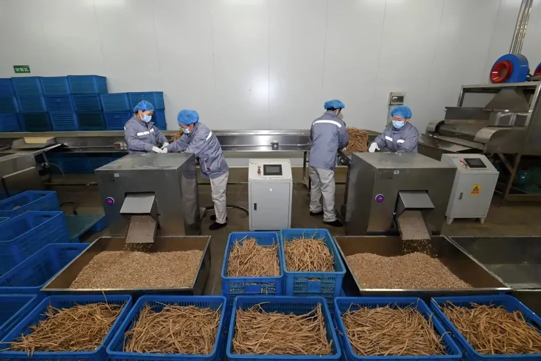 工人们进行党参分拣、切片