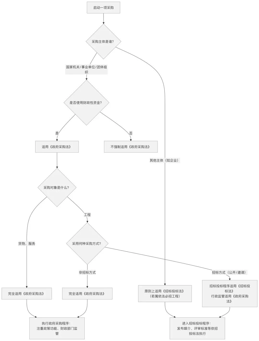核心判定逻辑 | “采购主体 + 资金性质” 双重标准:只要采购人是国家机关等,且使用了财政性资金,就应优先适用《政府采购法》。 | “项目性质” 标准:只要是法定的必须招标的工程建设项目,无论采购主体和资金性质(即使是非财政资金的国企投资),都必须适用《招标投标法》。 |
