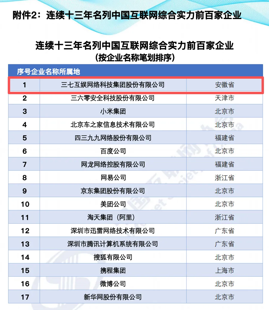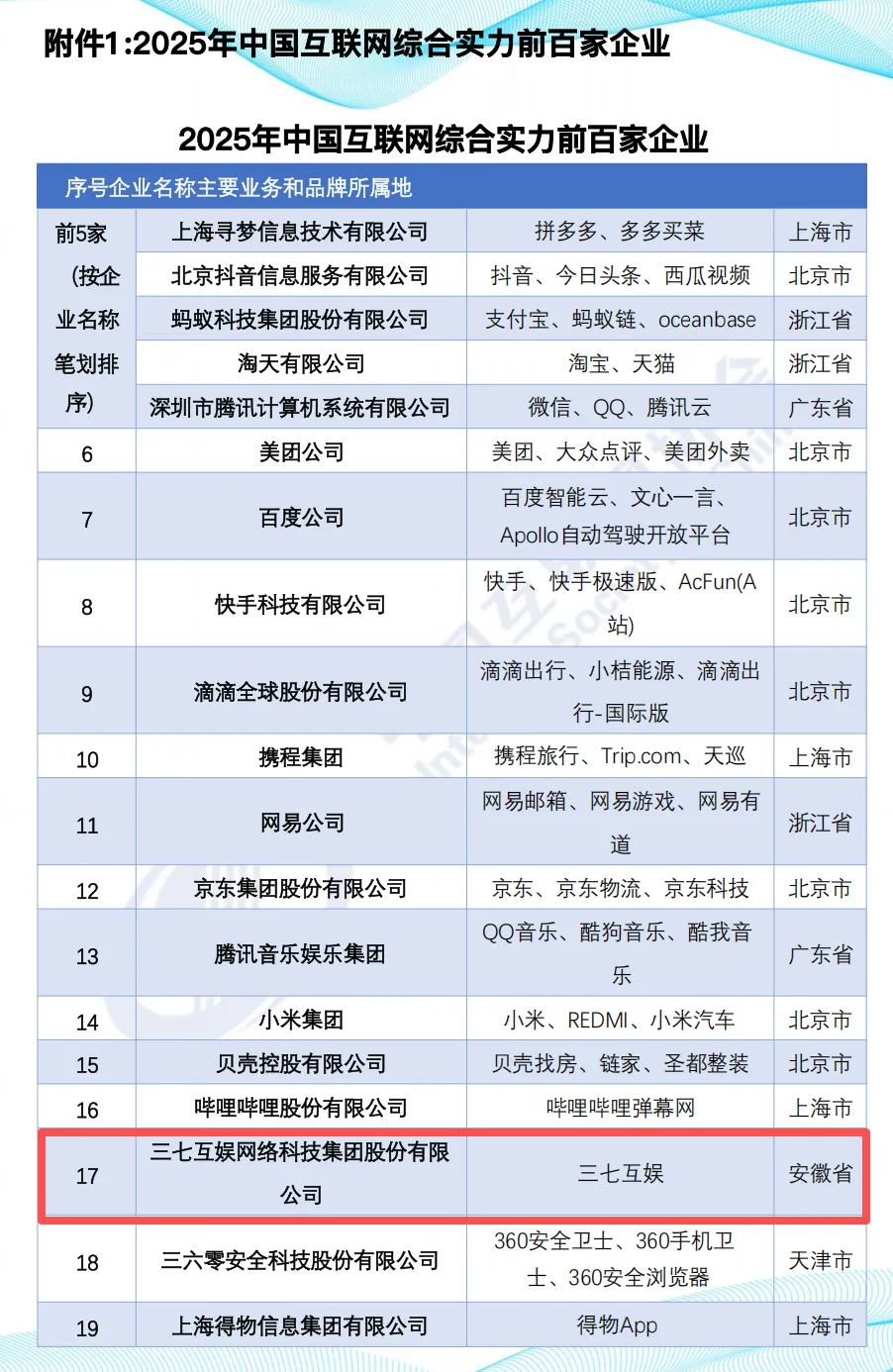 在2025年榜单中,三七互娱凭借企业规模与企业信用、AI创新突破、海外市场拓展成效及社会责任践行等多方面突出表现,排名上升至第17位,相较于2024年的第29位进步明显。此外,三七互娱与小米集团、百度公司、网易公司等17家企业共同入选“连续十三年名列中国互联网综合实力前百家企业”榜单。