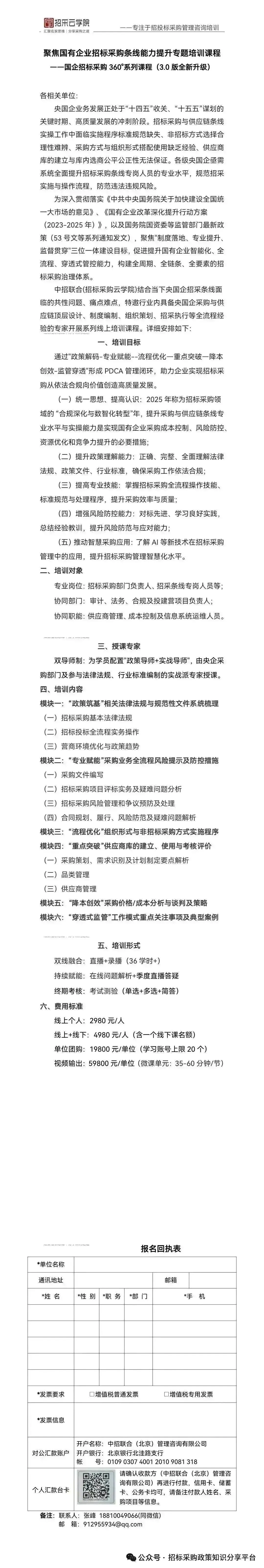 中招联合(招标采购云学院)结合当下央国企招采条线面临的共性问题、痛点难点,特邀行业内具备央国企采购与供应链顶层设计、制度编制、组织策划、招采执行等全流程经验的专家开展系列线上培训课程。详细安排如下: