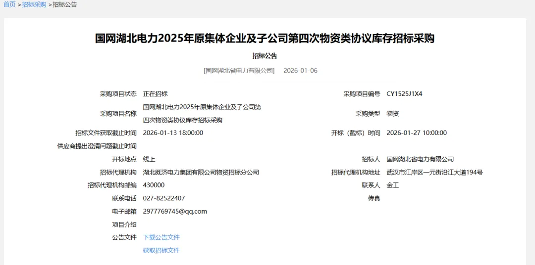 国网湖北电力2025年原集体企业及子公司第四次物资类协议库存招标采购