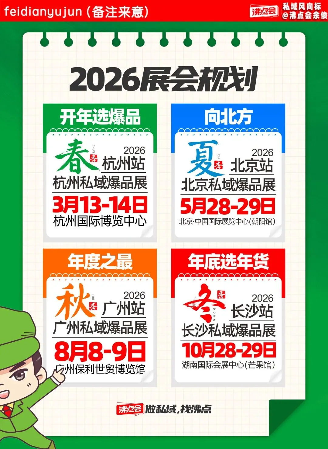 沸点会以会展为纽带,按春、夏、秋、冬四季,在 杭州、北京、广州、长沙 四城举办四届选品会。春季首站——3月13杭州私域电商展会,正是全年资源对接的黄金起点!