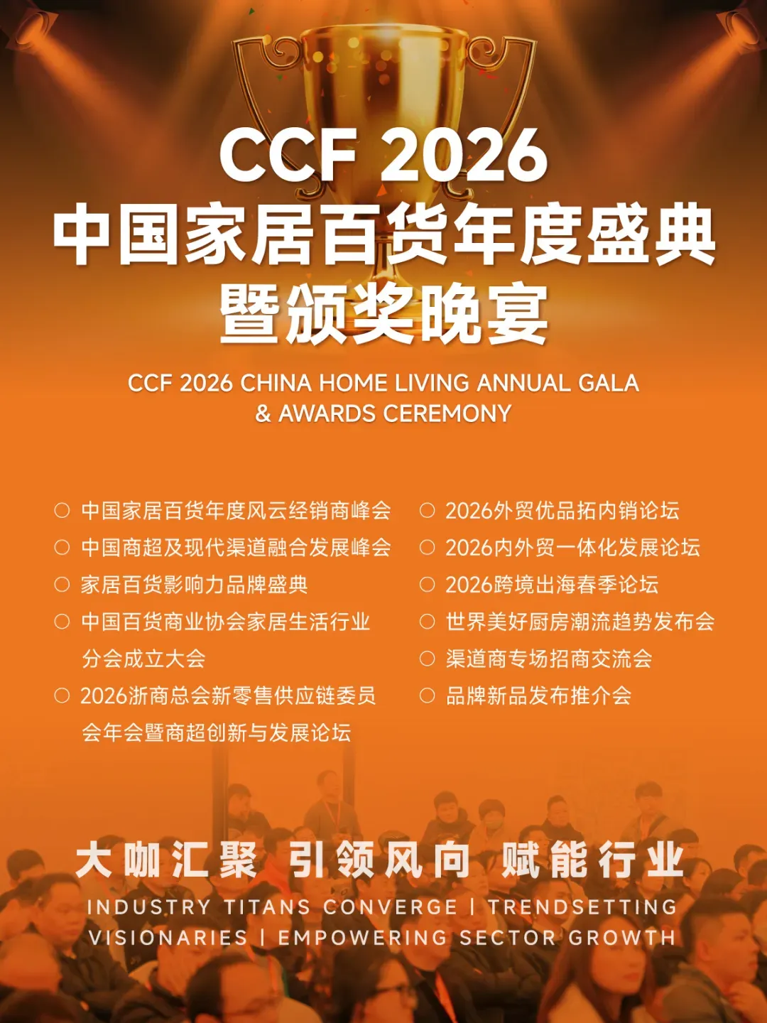 作为CCF SHANGHAI 2026上海国际家居及时尚生活博览会/上海国际日用百货(春季)博览会同期重磅活动,「2026时尚家居百货年度盛典暨颁奖晚宴盛典」旨在打造时尚家居百货行业年度规格最高、影响力最大、资源最集中的巅峰聚会。经销商、商超及现代渠道、品牌方三大核心力量齐聚一堂,融合社交晚宴、荣耀表彰、高峰论坛等多元内容,打造行业盛会,激发市场新活力。