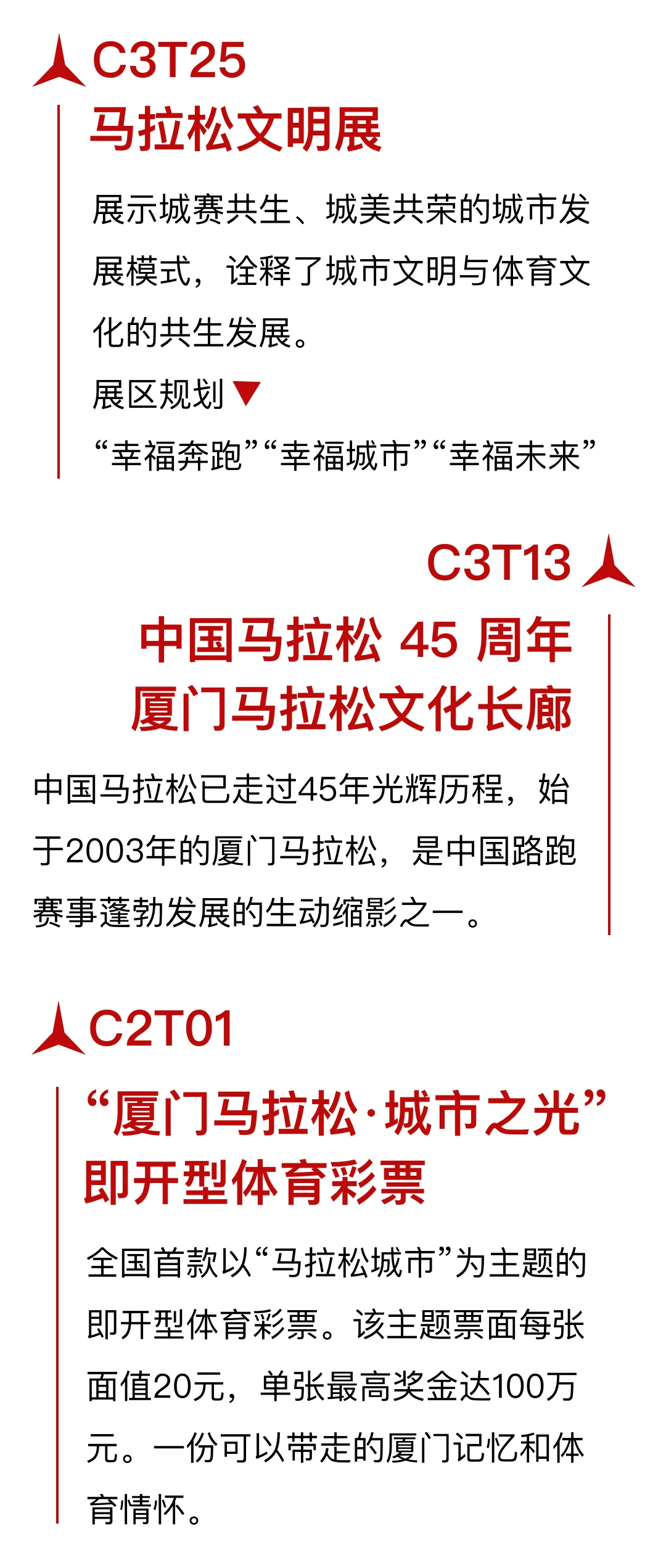 为进一步驱动产业和城市向纵深发展,展会期间将同步展出马拉松文明展、中国马拉松45周年厦门马拉松文化长廊及“厦门马拉松·城市之光”即开型体育彩票,共赏“体育+”新风尚,引领文明新风貌,多角度展现体育文化与城市文明相互促进的生动画卷。