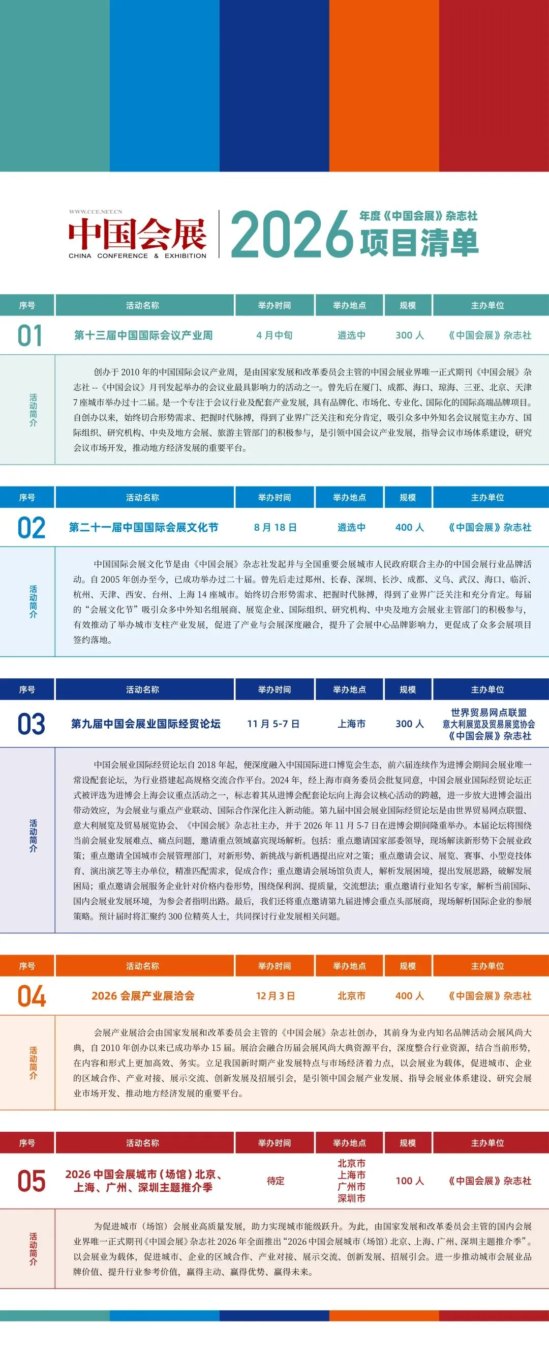 在“十五五”开局之年,为会展行业搭建高效务实的合作平台,《中国会展》杂志社正式发布2026年项目清单,为行业高质量发展注入强劲动力。本项目清单以赋能产业升级、搭建优质合作平台为核心目标,聚焦第十三届中国国际会议产业周、第二十一届中国国际会展文化节等核心项目,联动进博会、文博会及各类特色展会优质资源,构建多元协同的行业生态。本次发布创新采用“精准对接+定制适配”模式,摒弃统一标准限制,贴合市场实际需求灵活规划,同时整合政策宣传资源,提升合作价值。《中国会展》杂志社凭借行业权威传播与专业资源整合能力,为会展行业搭建高效沟通桥梁,助力会展业在新一年凝聚发展合力、开拓更广阔空间。