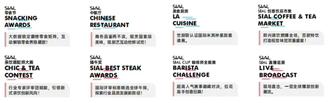 2026年SIAL西雅展(上海)将持续打造高质量、高品质的国际活动赛事,包括SIAL零食节、SIAL CUP咖啡师全能赛、SIAL中餐厅、SIAL臻牛奖、SIAL茶饮调配师大赛、SIAL美食厨房、SIAL创意饮品市集及SIAL直播逛展。这些活动旨在引领新消费趋势、创新消费场景,为展商提供品牌曝光、新品推广、专业交流及精准对接的高价值平台,助力企业快速触达目标客群,提升行业影响力并拓展市场商机。
